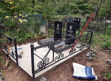 В данном заказе нам предстояло полностью благоустроить место захоронения. Клиент пожелал заменить на участке всё, кроме ограждения. Нам предстояло изготовить два классических гранитных памятника с прямоугольными цветниками, а также выложить территорию могилы брусчаткой. Первым делом мы приехали на кладбище и оценили исходное состояние места захоронения: оно поросло сорняком, а потому выглядело заброшенным.